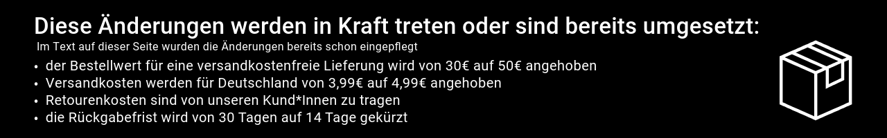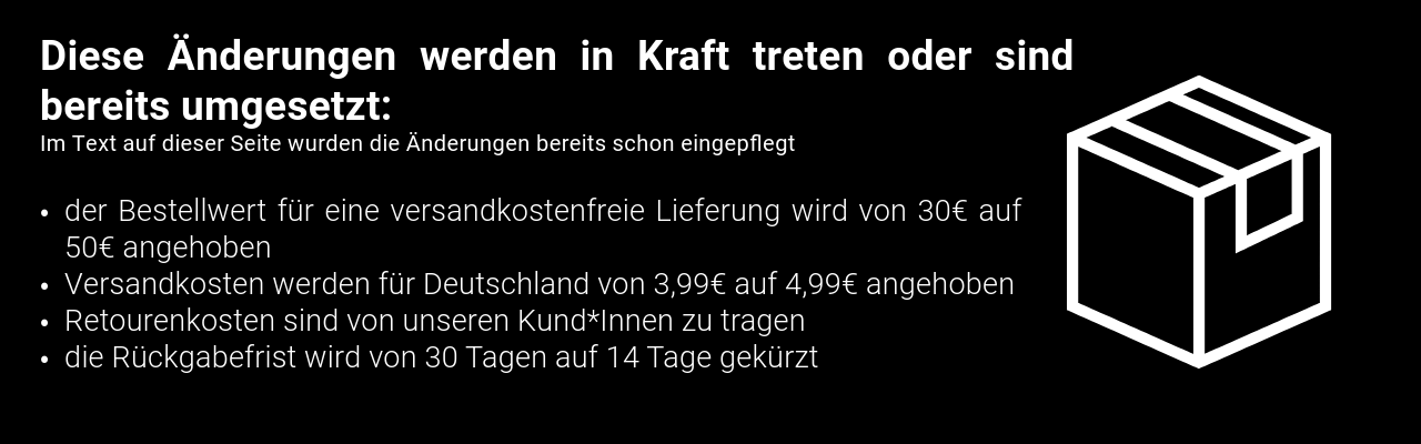 Wir versenden spätestens am nächsten Werktag – versandkostenfrei ab 50€ Bestellwert (innerhalb Deutschlands). Bei Bestellungen unter 50€ erlauben wir uns, 4,99€ Versandkosten zu erheben. Bei allen internationalen Bestellungen fallen bis zu 9,99€ Versandkosten an. Ab 100€ Bestellwert ist auch der internationale Versand kostenfrei. Die Lieferzeit innerhalb Deutschlands beträgt 1-2 Werktage, für internationale Sendungen je nach Destination länger. Sobald wir Deine Bestellung verschickt haben, bekommst Du eine E-Mail-Benachrichtigung mit Angabe der DHL-Tracking-Nummer. Du kannst den Sendungsstatus nach ein bis zwei Stunden tracken.